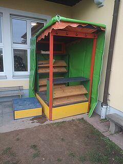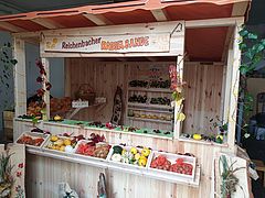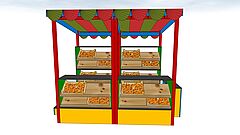 Auf beigefügtem Foto sehen Sie ein Beispiel: möglich mit mehr Kisten, unterschiedlichen Höhen und neben dem Warenangeboten (Obst, Gemüse und Gebasteltes) kann man viele Kinder vorstellen. Dekorierbar mit allem, was das Herz begehrt, wie ein Schild mit dem Einrichtungsnamen etc.