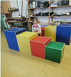 Der kidsMARKTSTAND als Kistenmodell ist sehr leicht zu konfigurieren: Höhe der Warenpräsentation sowie Gänge: je nach Anzahl der Kinder und ggf. auch für Kinder im Rollstuhl geeignet.